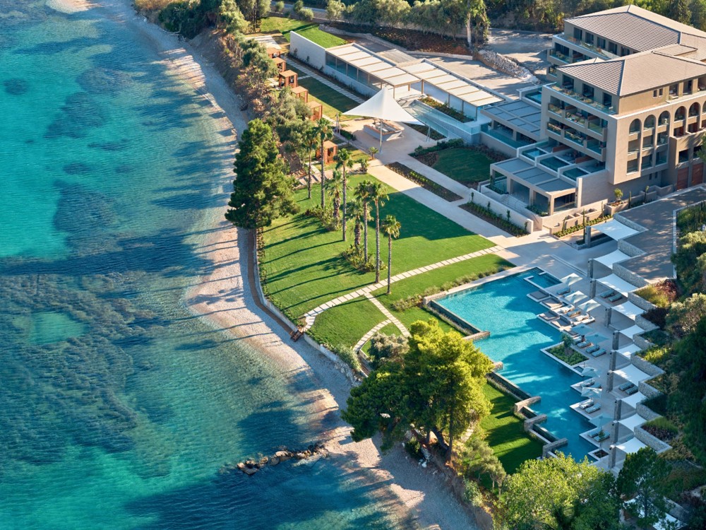 Avali, nestled in a serene bay on Corfu, offers a tranquil escape with majestic mountains behind and the sparkling Ionian Sea in front. This boutique beach hotel ensures everything is just steps away, providing a laid back atmosphere perfect for relaxation.
